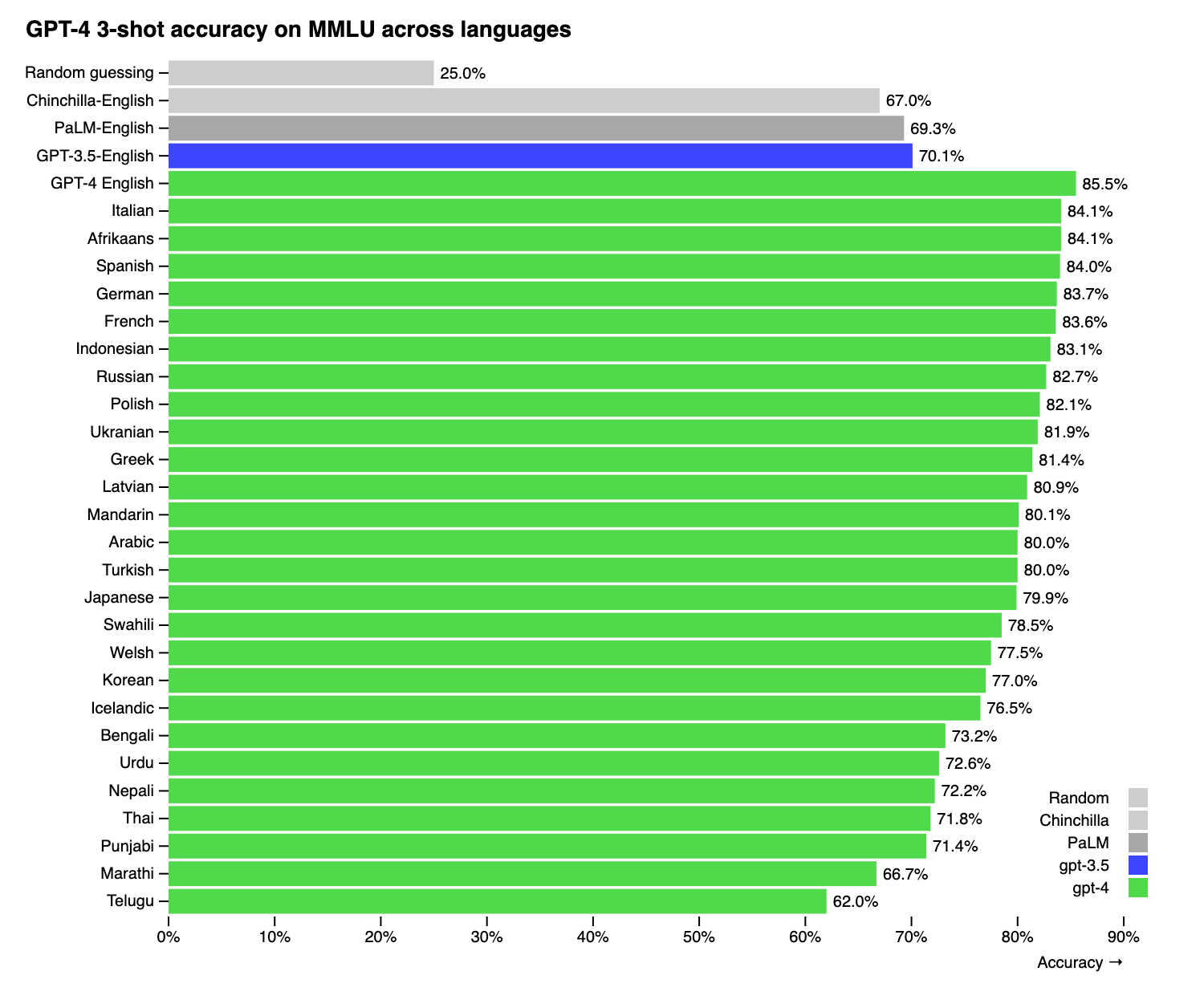 GPT-4 was tested on a translated version of the MMLU benchmark in 26 different languages. It outperformed GPT-3.5 and other LLMs in 24 out of the 26 languages tested, including low-resource languages like Latvian, Welsh, and Swahili. The Datacamp and MakeUseOf articles also note GPT-4's multilingual capabilities, with support for translation between English, French, German, Spanish, Chinese, Japanese, Korean and more. Translated Labs points out that GPT-4 has disparities in performance between English and other languages due to the predominance of English in its training data. Their T-LM product helps address this by translating prompts to enhance GPT-4's capabilities in 200 languages.